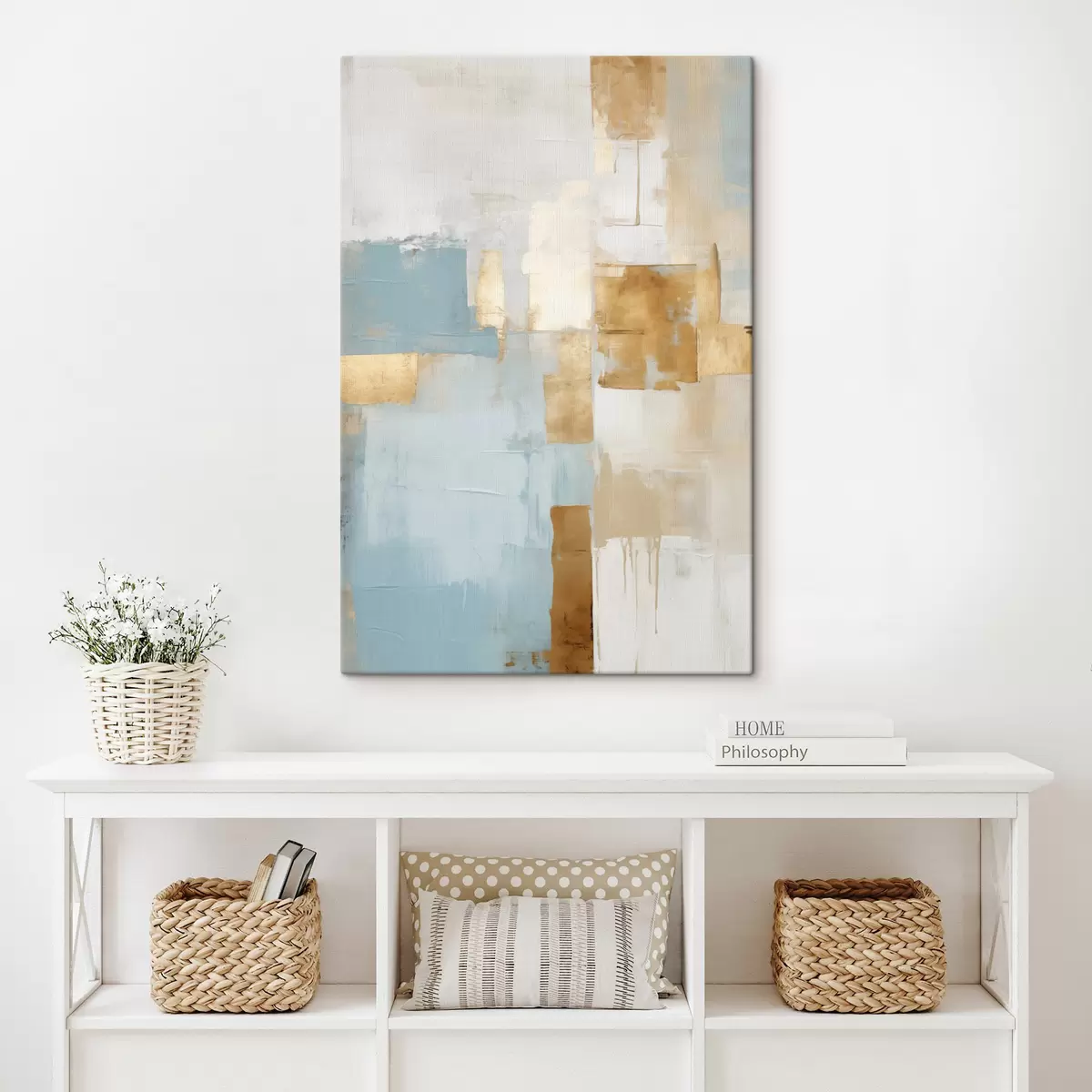 Gemälde Abstrakte geometrische Formen in Gelb, Blau und Weiß, strukturierte und minimalistische Komposition Art. s47882