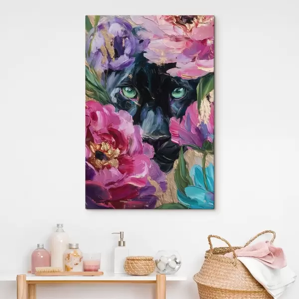 Gemälde Eine schwarze Pantherin schaut zwischen den Pfingstrosen hervor. Art. s47936