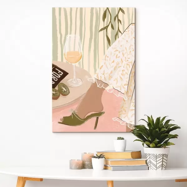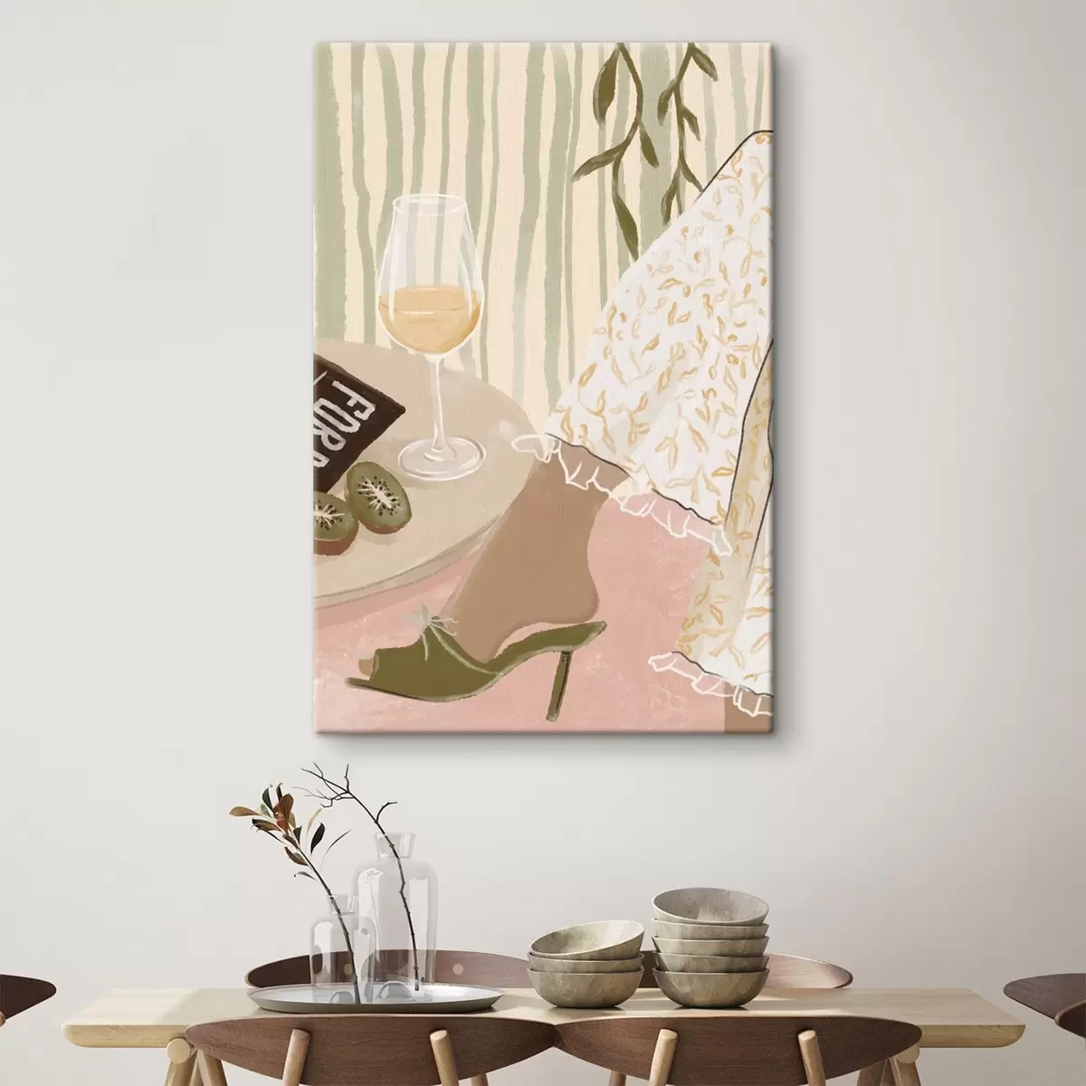 Gemälde Tisch mit Weinglas und Kiwi neben Kleid Art. s48021