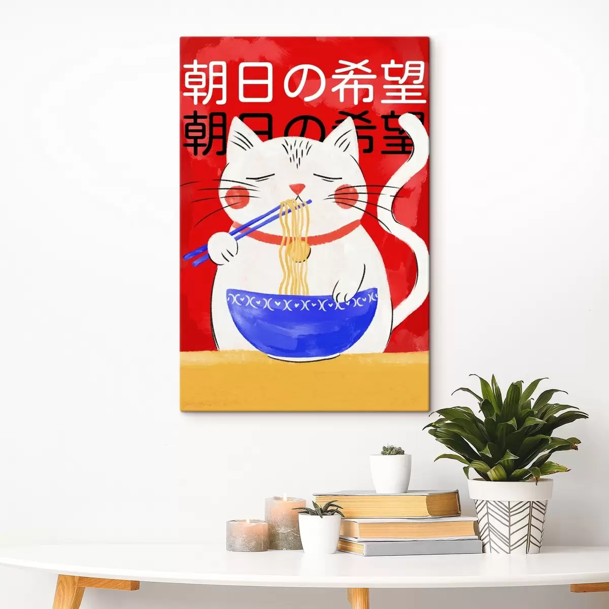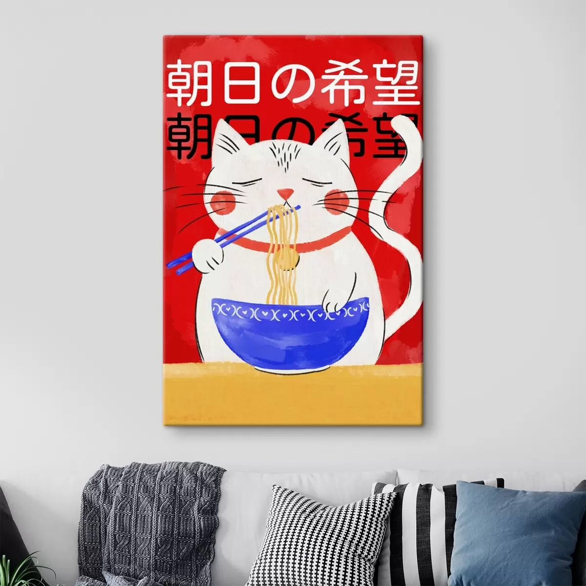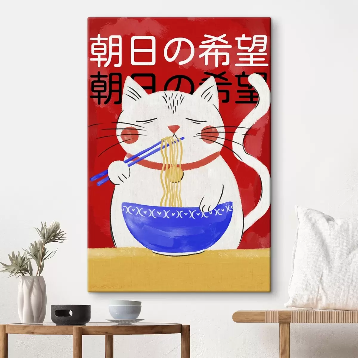 Gemälde Illustration einer Katze, die auf rotem Hintergrund Nudeln isst Art. s48031