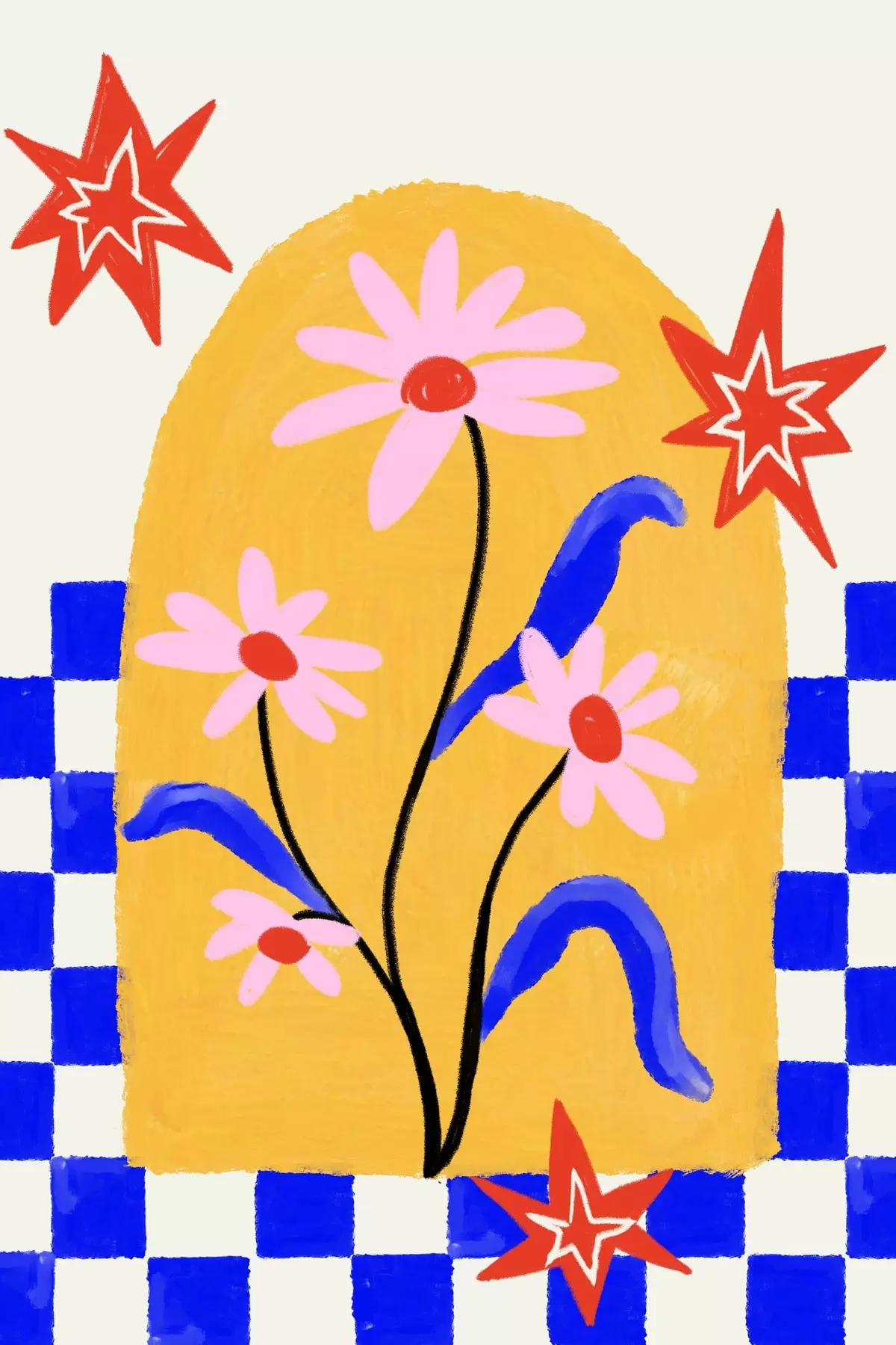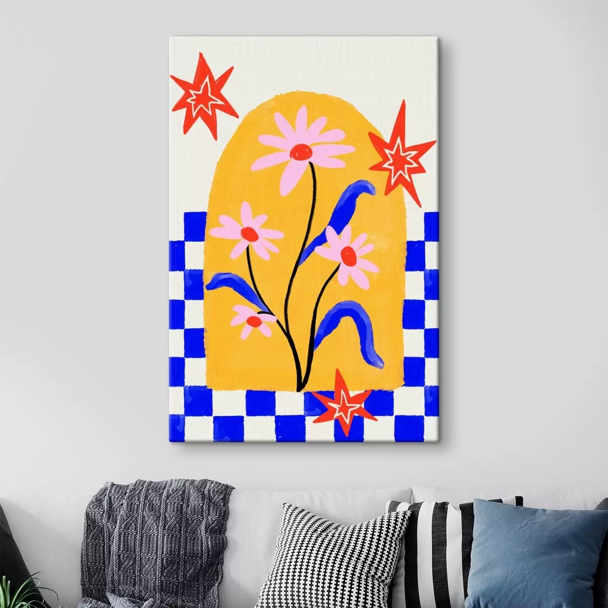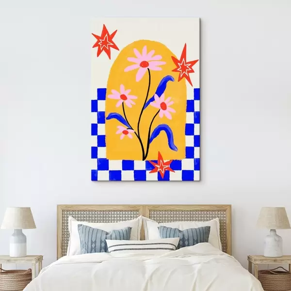 Gemälde Leuchtende Blumen auf gelbem Hintergrund mit blauem Muster Art. s48034