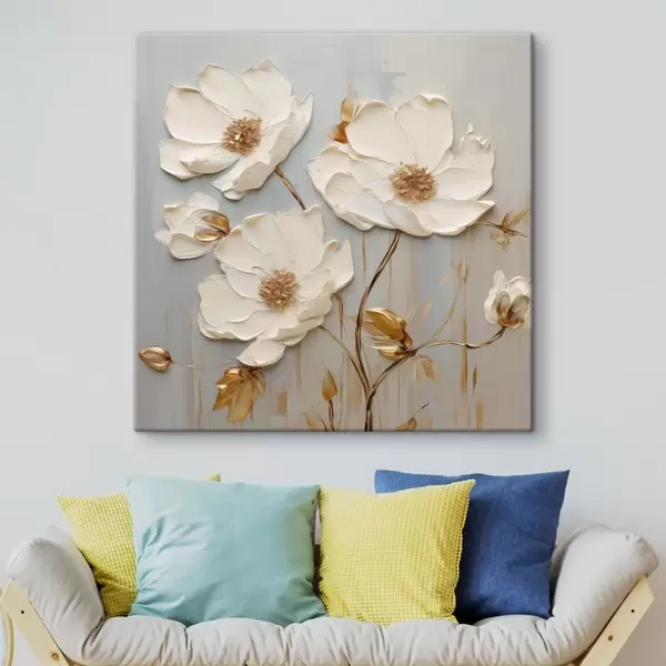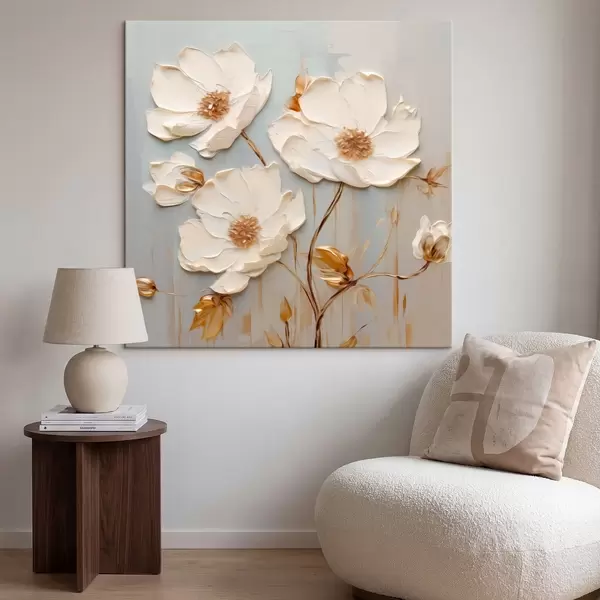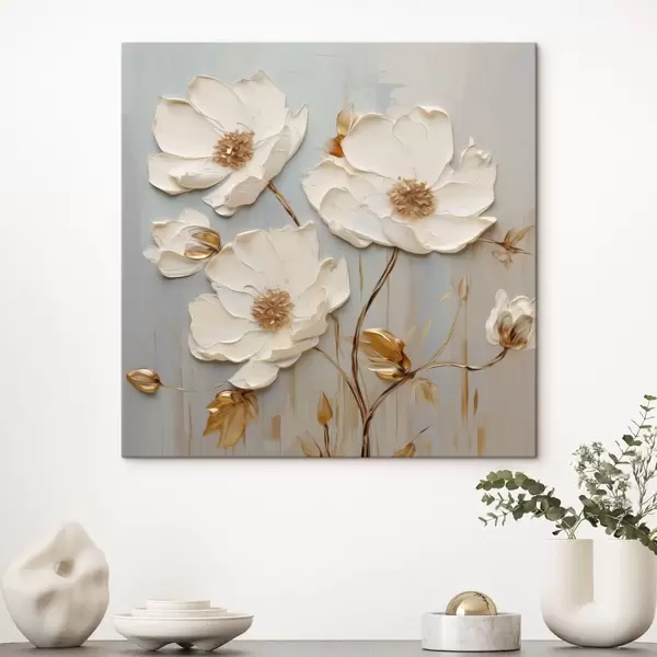 Gemälde Reliefartige weiße Blüten mit warmen Blättern Art. s48093