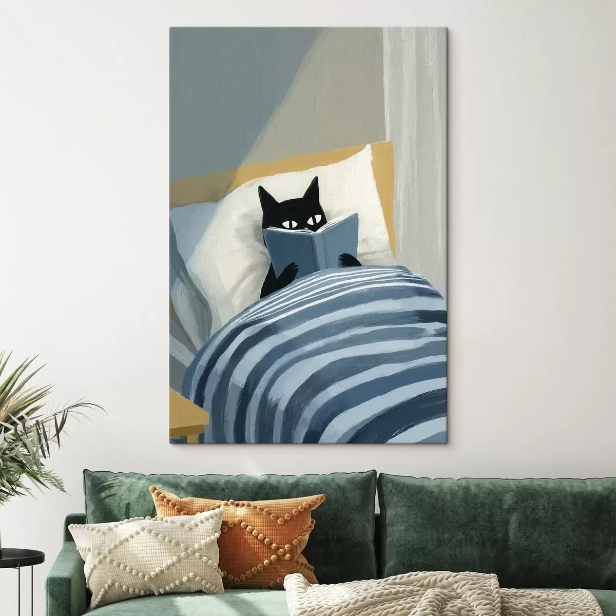 Gemälde Minimale flache Illustration einer schwarzen Katze, die im Bett ein Buch liest Art. s48117