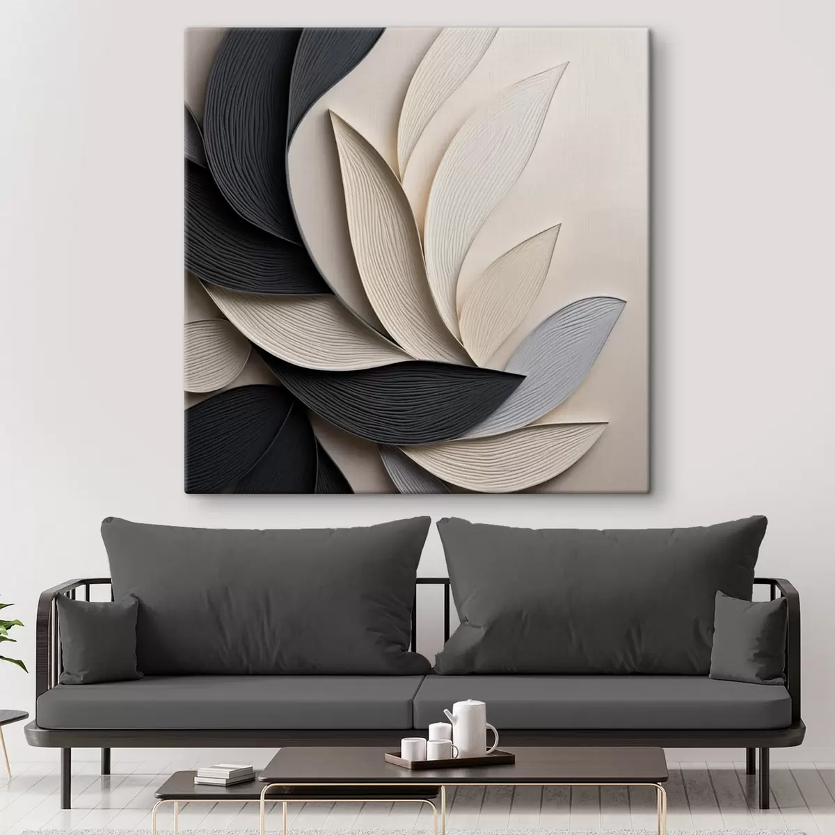 Gemälde Abstrakte Komposition aus übereinanderliegenden Blättern, geschwungenen Formen in Schwarz, Weiß und Beige, strukturierte Kunst Art. s48381
