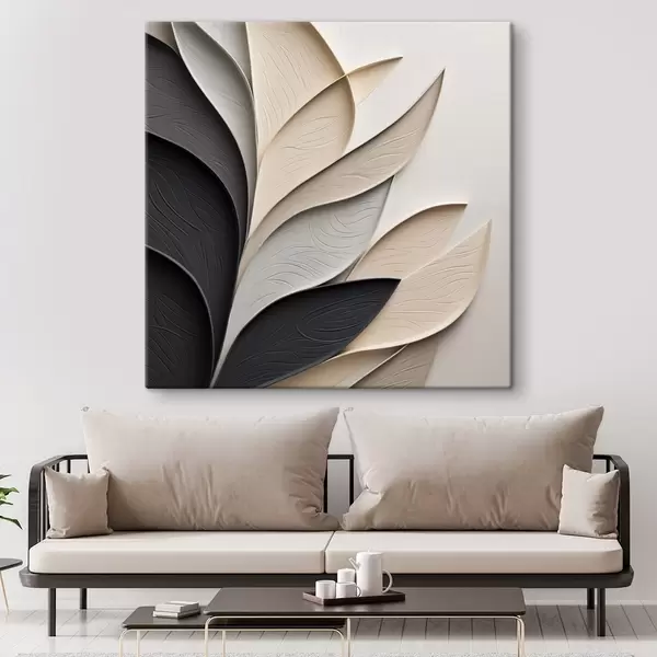 Gemälde Abstrakte Komposition aus übereinanderliegenden Blättern, geschwungenen Formen in Schwarz, Weiß und Beige, strukturierte Kunst Art. s48382