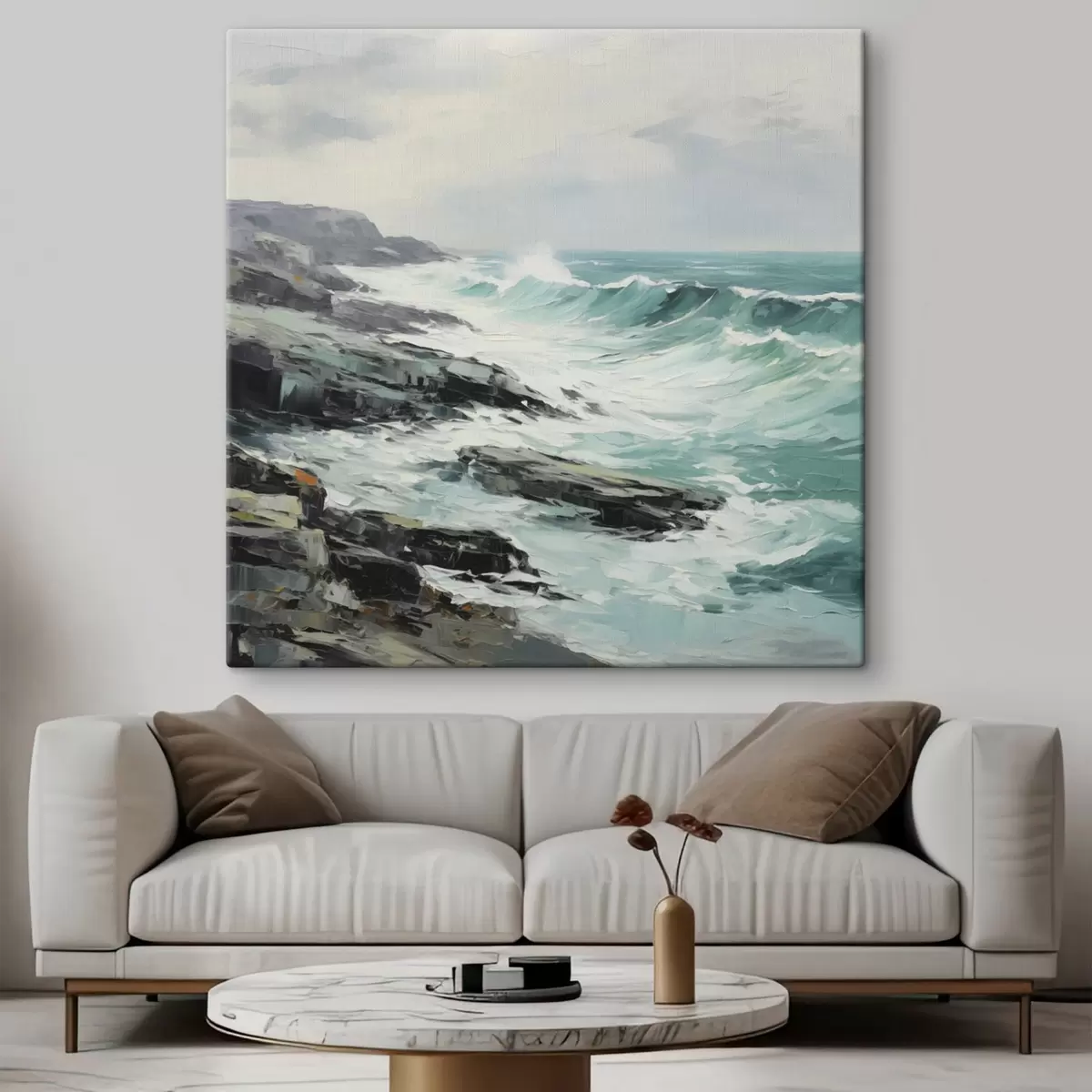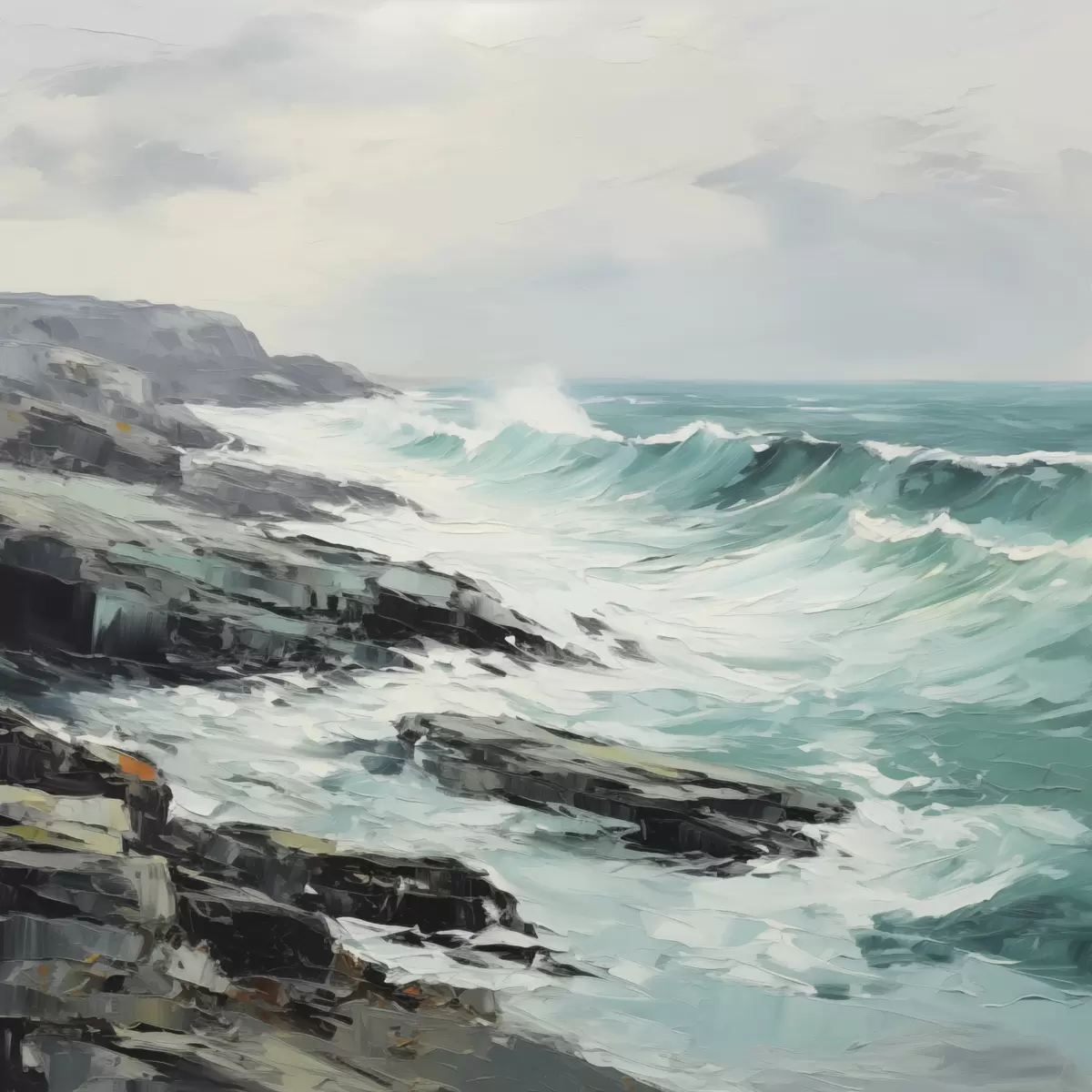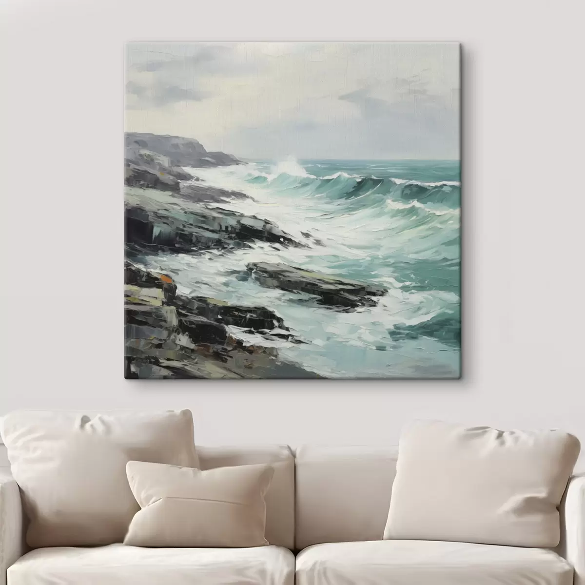 Gemälde Eine felsige Küstenlandschaft mit Wellen unter bewölktem Himmel, im Stil eines Gemäldes Art. s48387