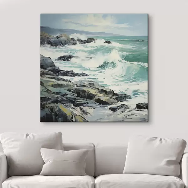 Gemälde Eine felsige Küstenlandschaft mit Wellen unter bewölktem Himmel, im Stil eines Gemäldes Art. s48388