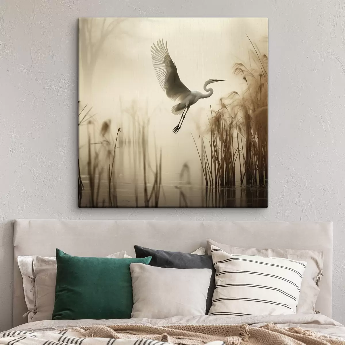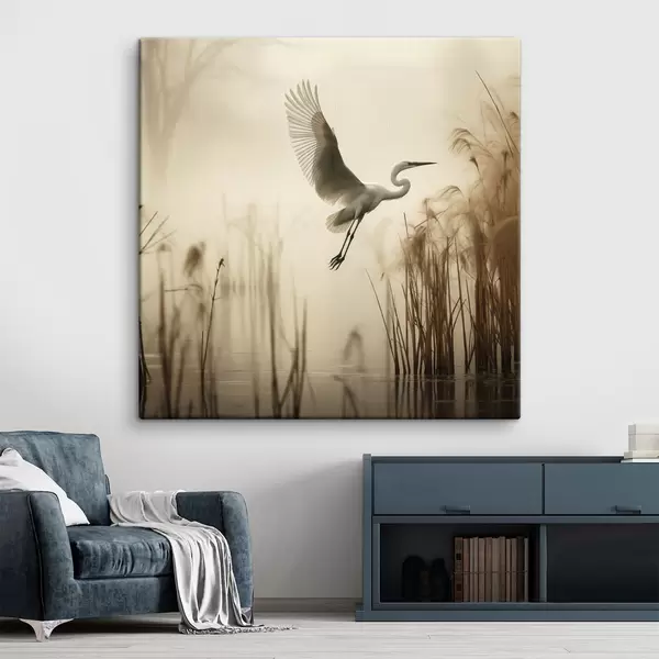 Gemälde Ein Silberreiher fliegt über einen See, umgeben von hohem Schilf und Bäumen im Hintergrund Art. s48389