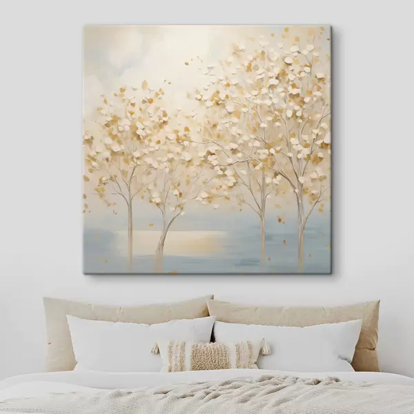 Gemälde Ein strukturierter Malstil, der Bäume mit weißen und gelben Blättern vor einem hellblauen Hintergrund zeigt Art. s48392