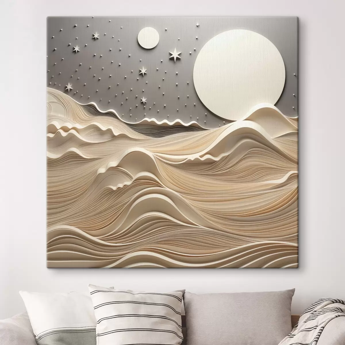 Gemälde Eine minimalistisch stilisierte Landschaft mit sanften Hügeln und einem großen Mond am Sternenhimmel, abstrakte Kunst Art. s48401