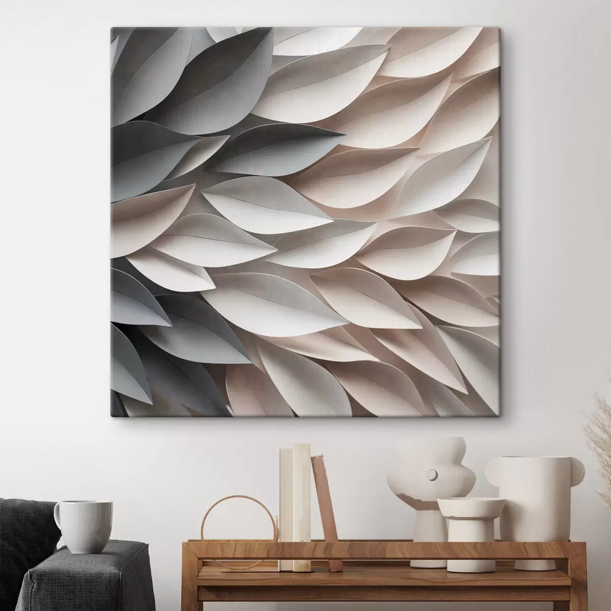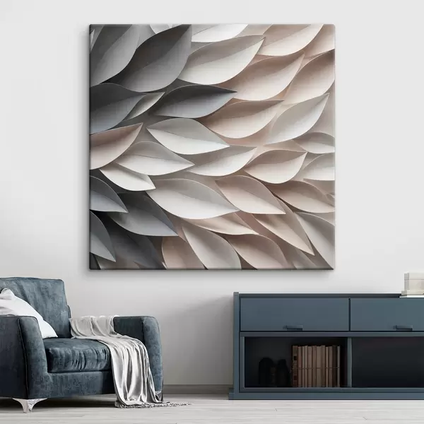 Gemälde Ein strukturiertes, sich überlappendes abstraktes Blattmuster in neutralen Beige-, Creme- und Grautönen Art. s48408
