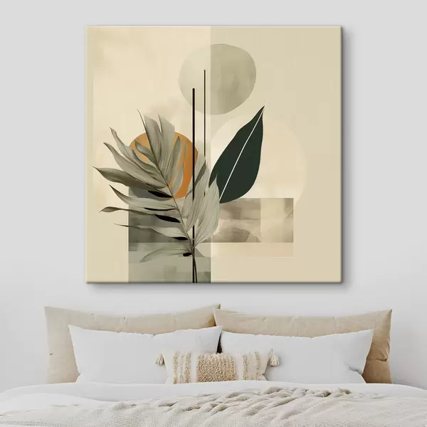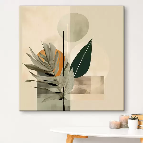Gemälde Eine dunkelgrüne Pflanze mit abstrakten geometrischen Formen und Aquarellstrukturen in Beige und Grün Art. s48410