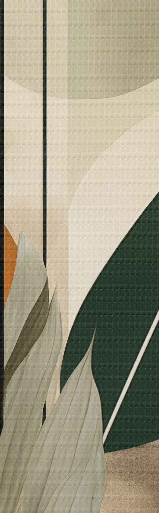 Fototapete Eine dunkelgrüne Pflanze mit abstrakten geometrischen Formen und Aquarellstrukturen in Beige und Grün s48410