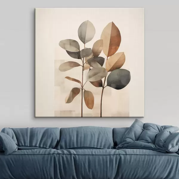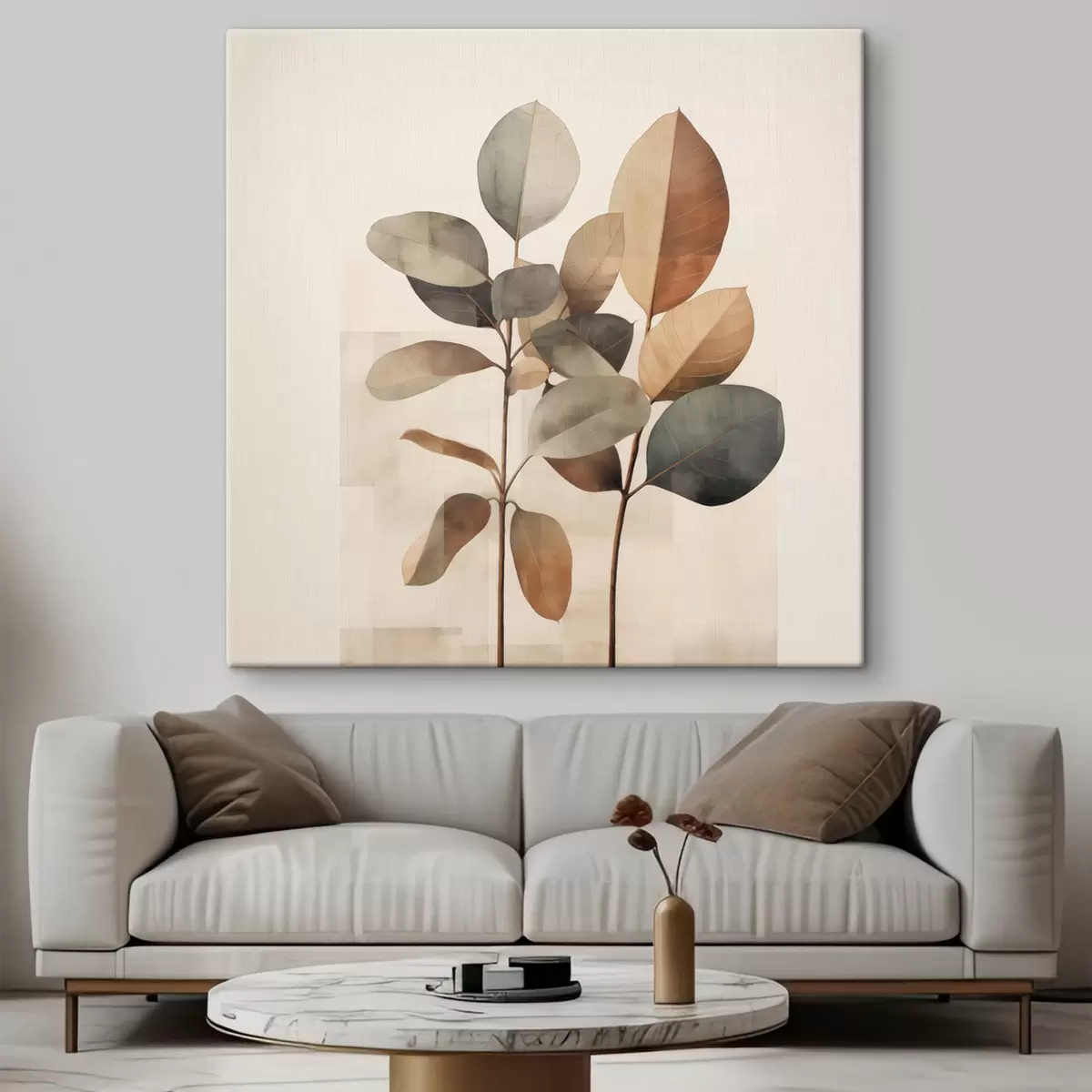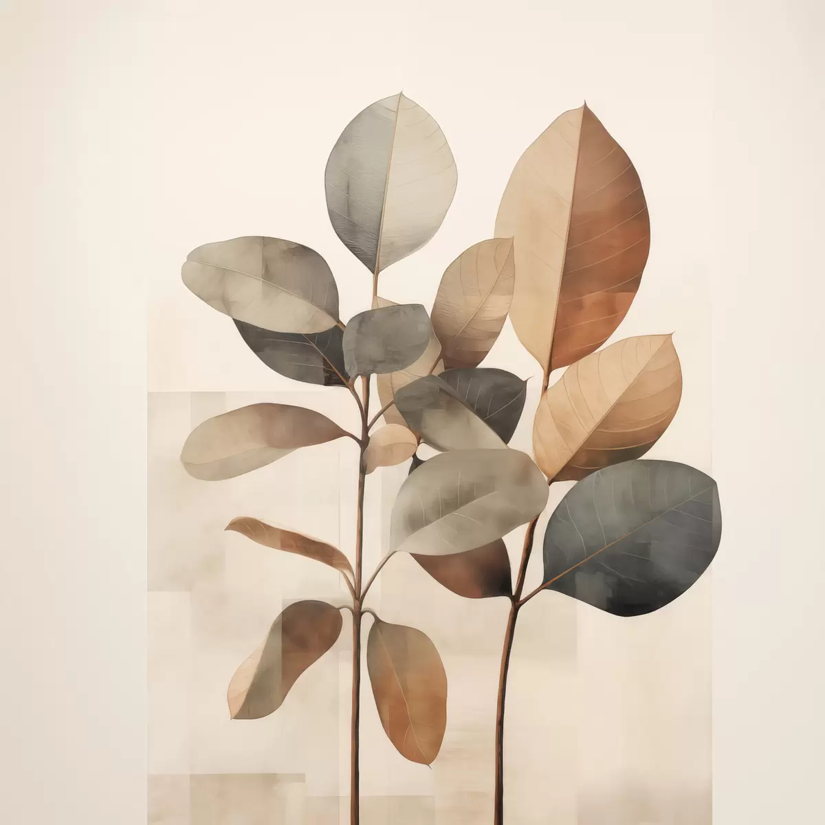 Gemälde Hohe Pflanzen mit ovalen Blättern in gedeckten Farbtönen und abstrakten rechteckigen Formen Art. s48413