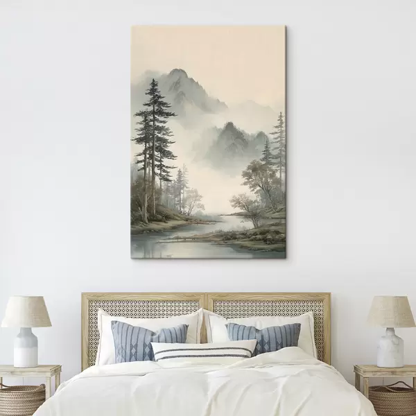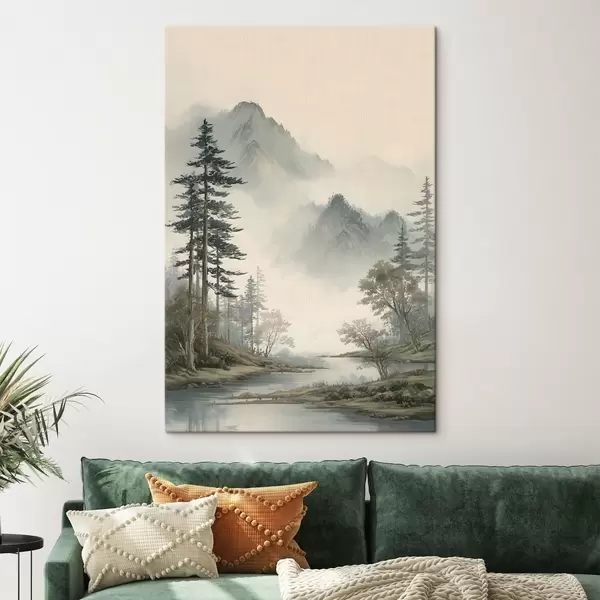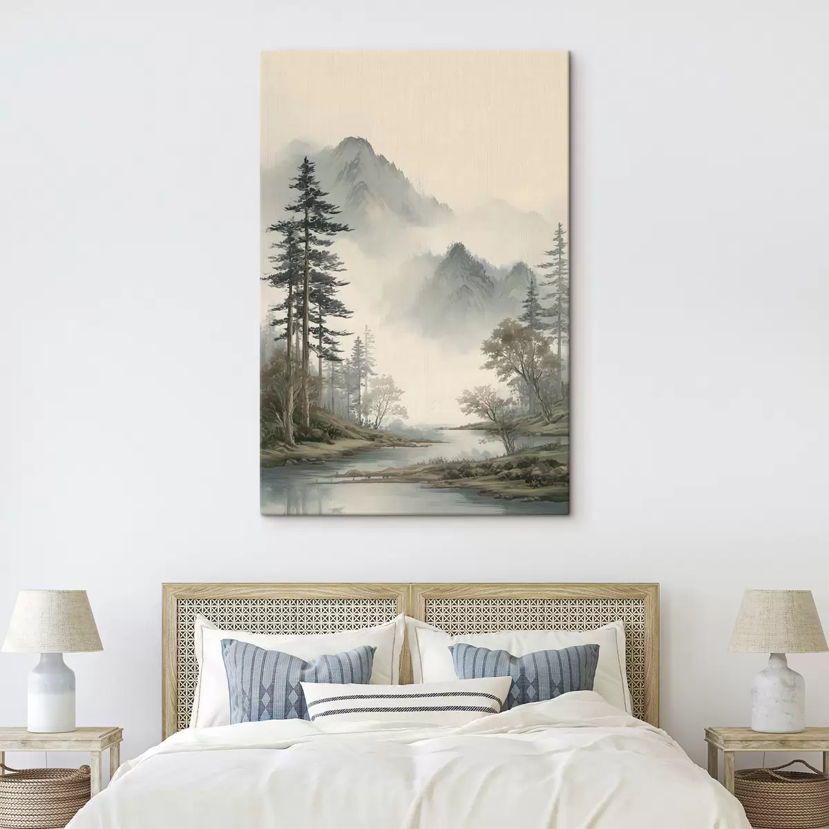 Gemälde eine Berglandschaft mit Kiefern und einem Fluss Art. s48531