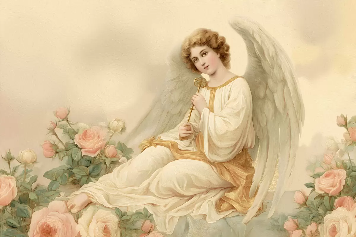 Fototapete ein Engel inmitten von Blumen im Stil eines Ölgemäldes s48554