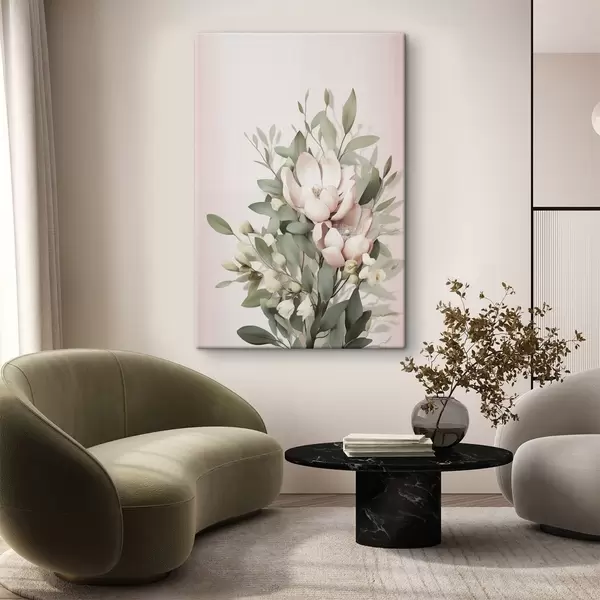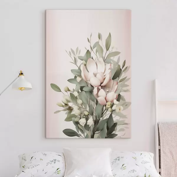 Gemälde Ein Strauß pastellfarbener Blumen mit Eukalyptusblättern vor hellrosa Hintergrund Art. s48728