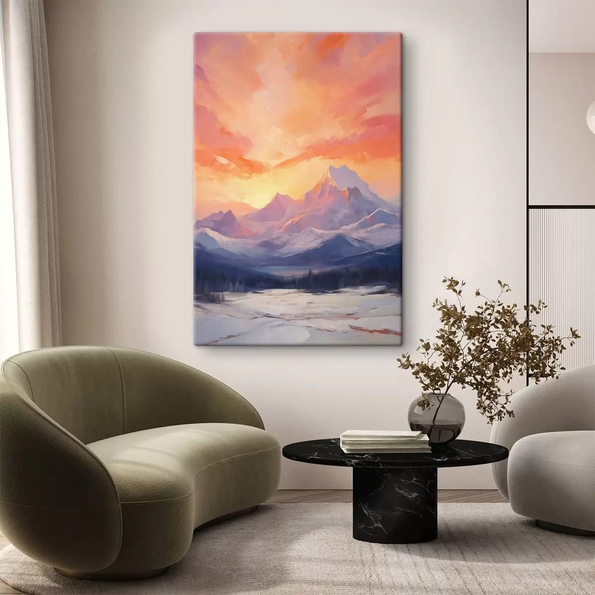 Gemälde Schneebedeckte Berge unter einem leuchtend orange-rosa Himmel mit Wolken Art. s48741