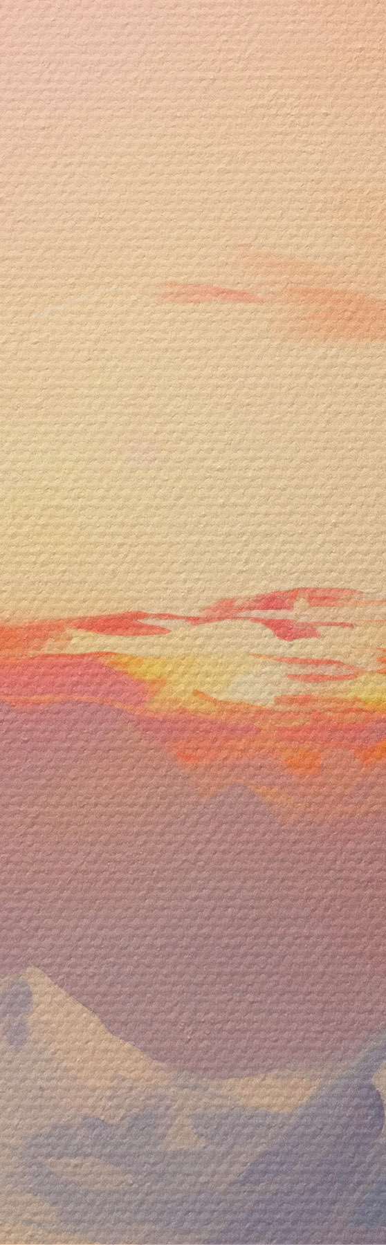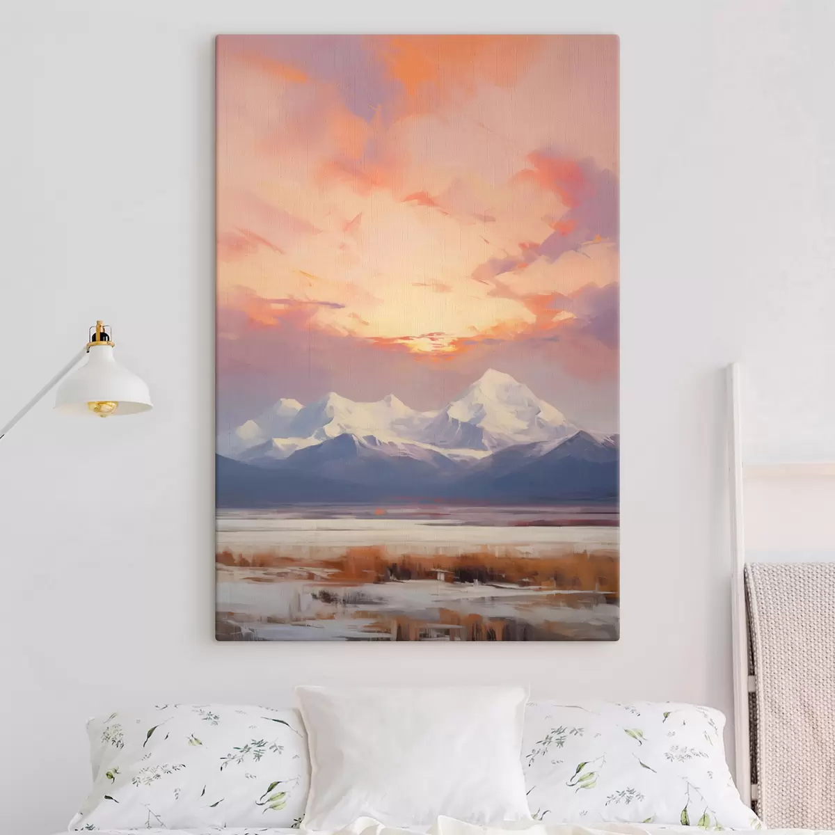 Gemälde Schneebedeckte Berge unter einem leuchtend orange-rosa Himmel mit Wolken Art. s48742