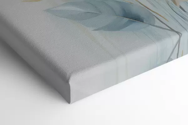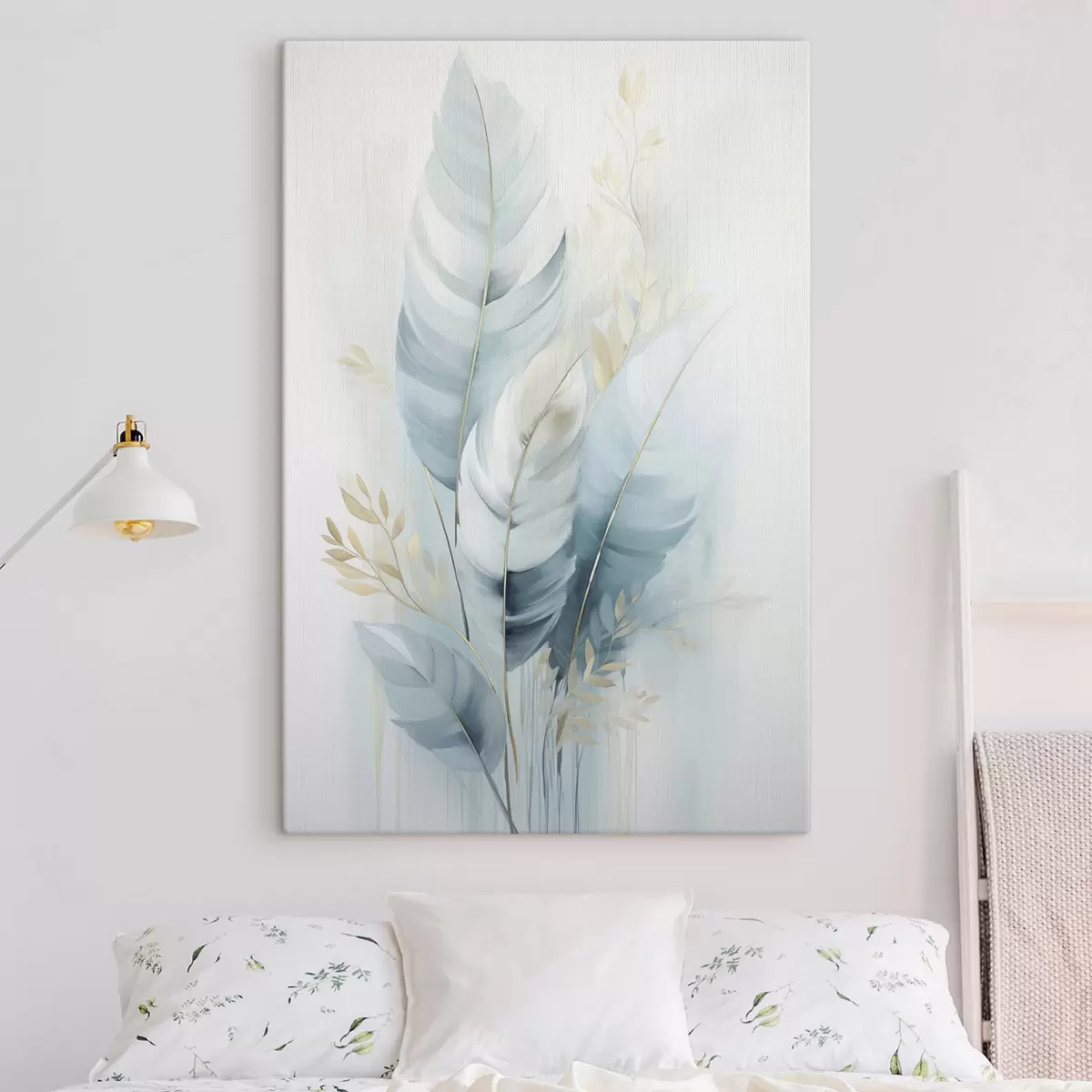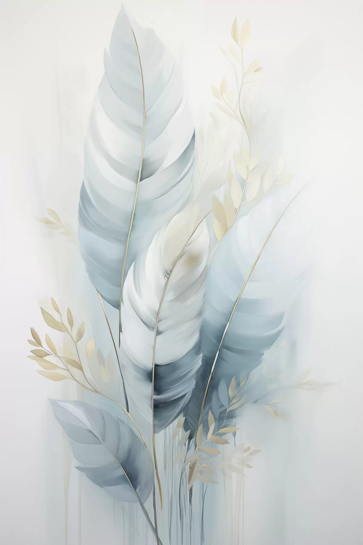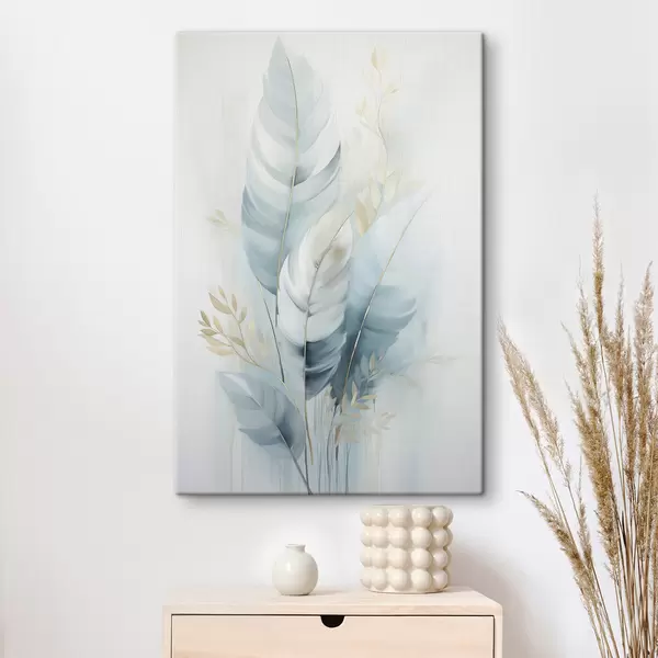 Gemälde Große, weiche Federn in Blau- und Weißtönen mit zarten beigen Blättern Art. s48749