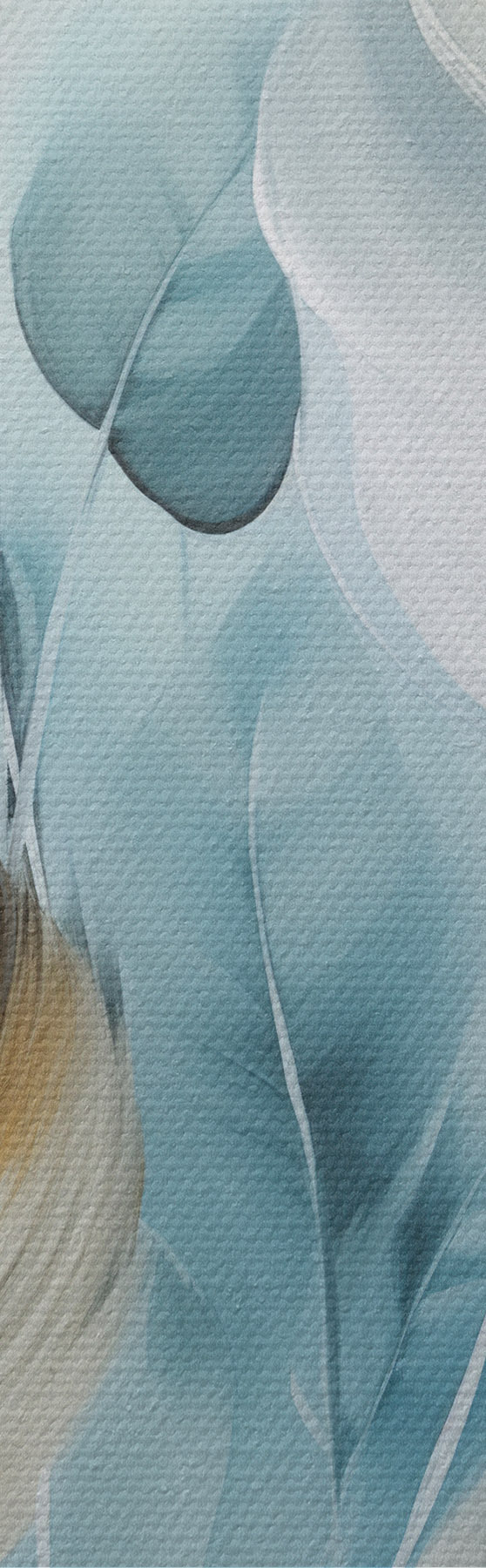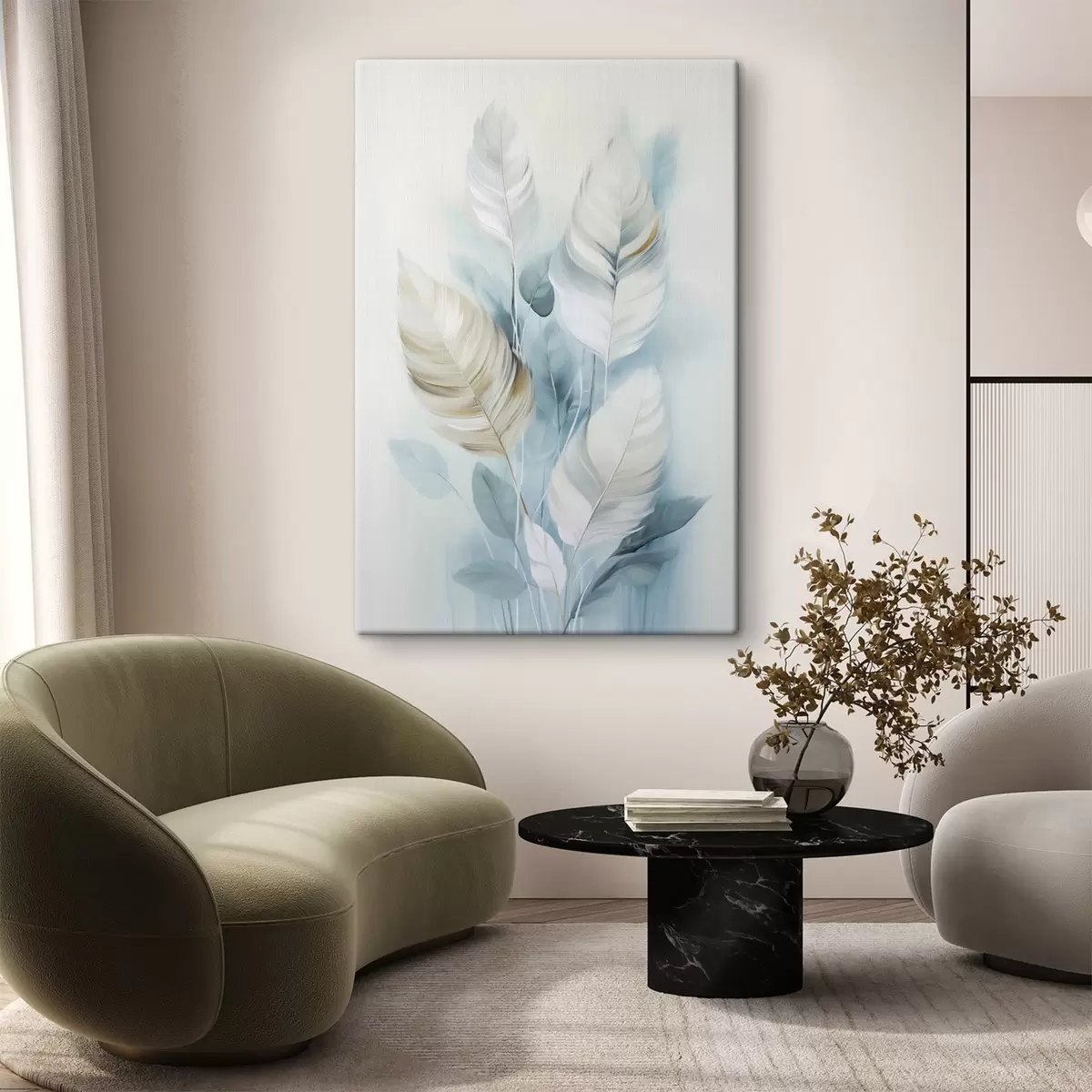 Gemälde Große, weiche Federn in Blau- und Weißtönen mit zarten beigen Blättern Art. s48750