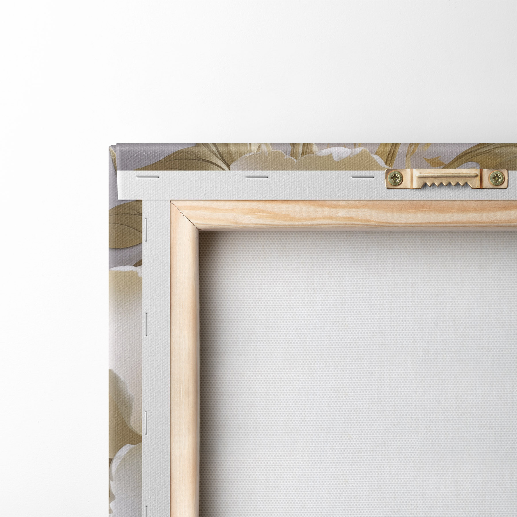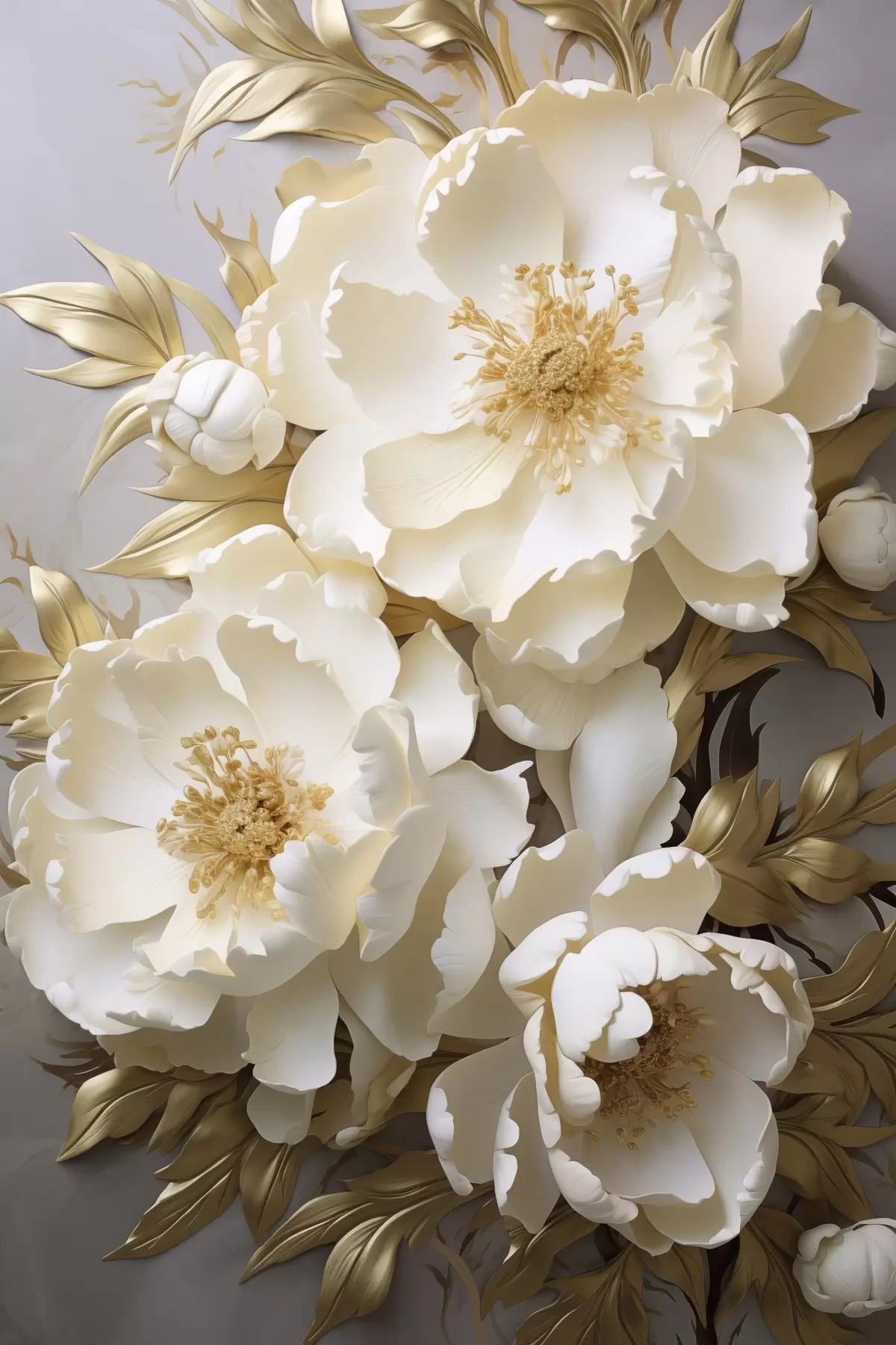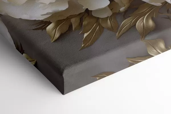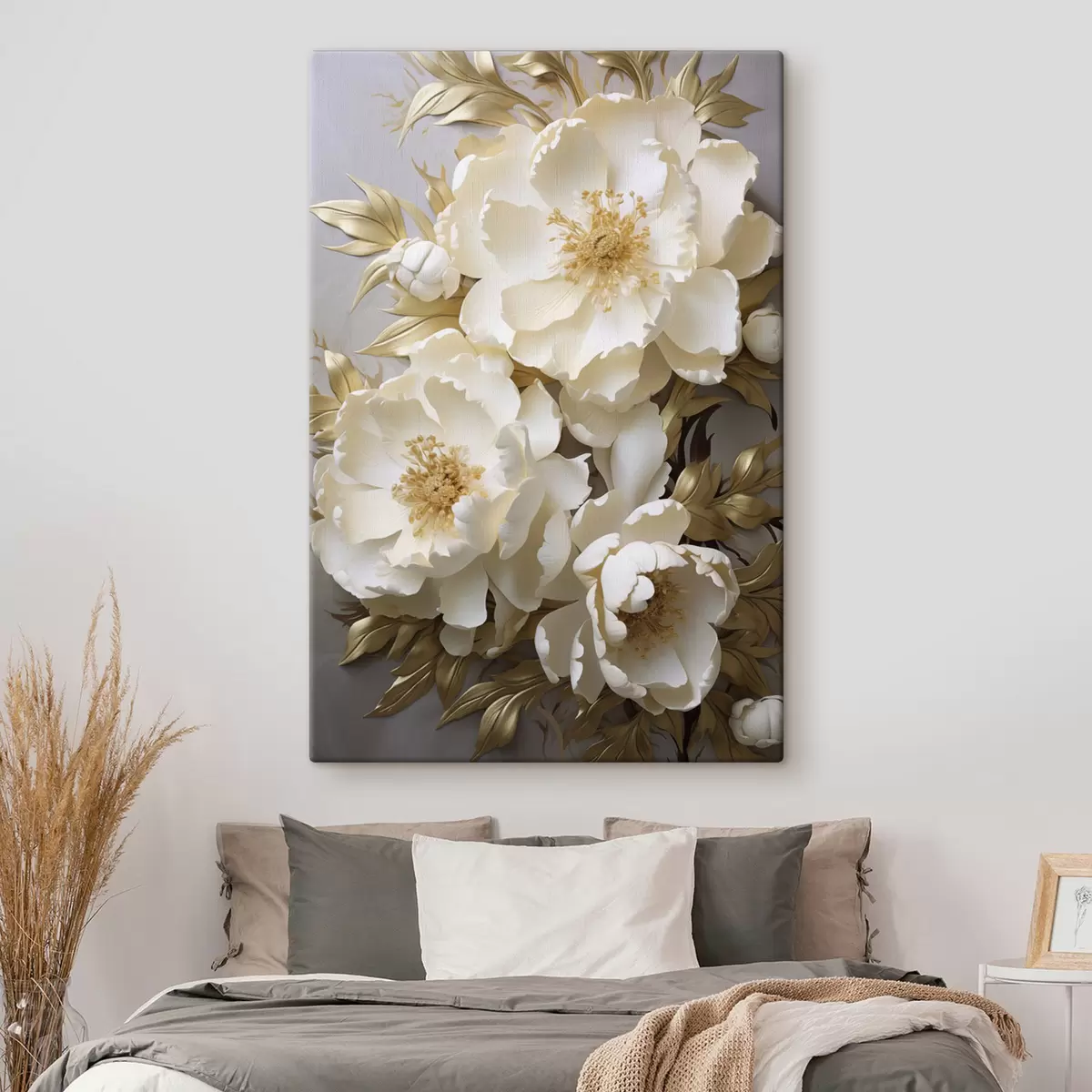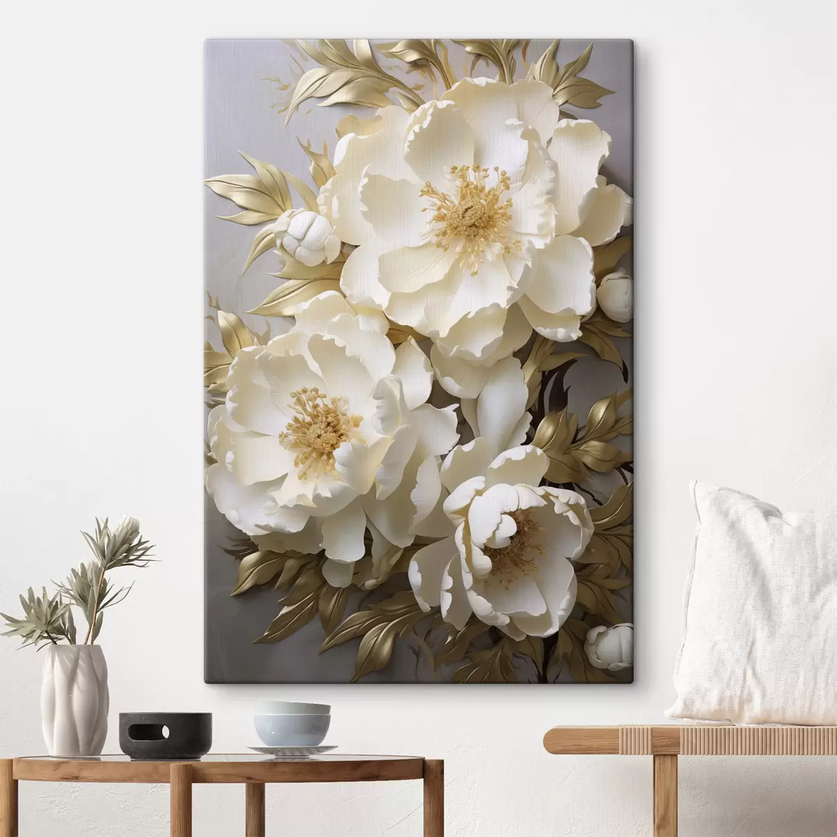 Gemälde Große weiße Pfingstrosen mit gelben Blättern vor grauem Hintergrund Art. s48754