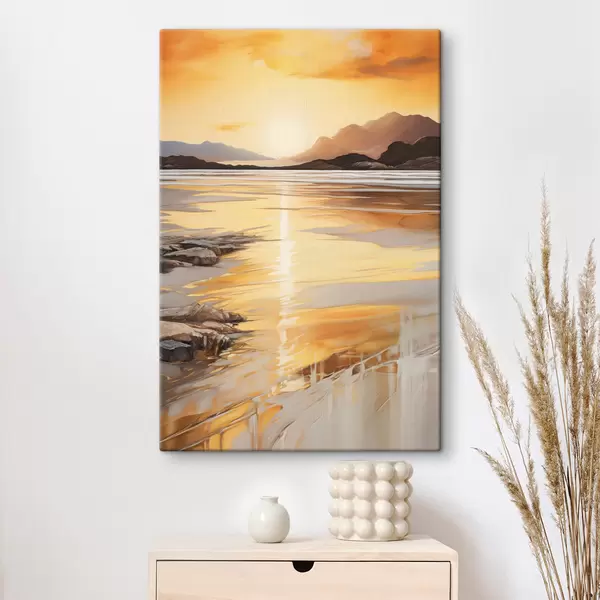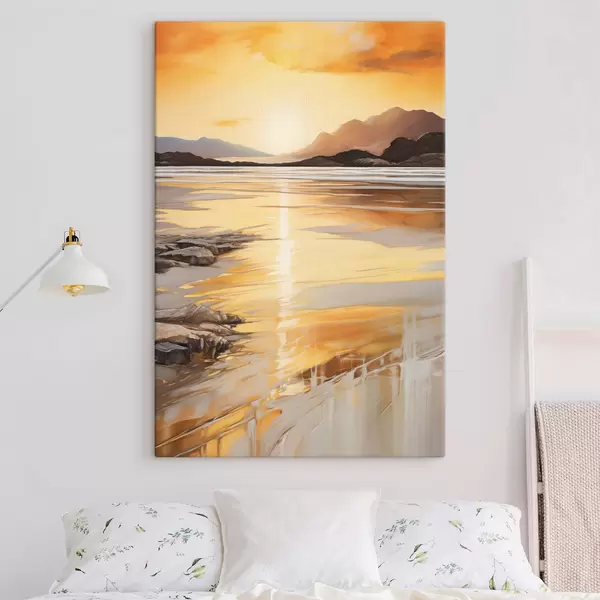 Gemälde Eine Landschaft mit einem Fluss und Bergen unter einem warmen orangefarbenen Himmel, Sonnenuntergang Art. s48756