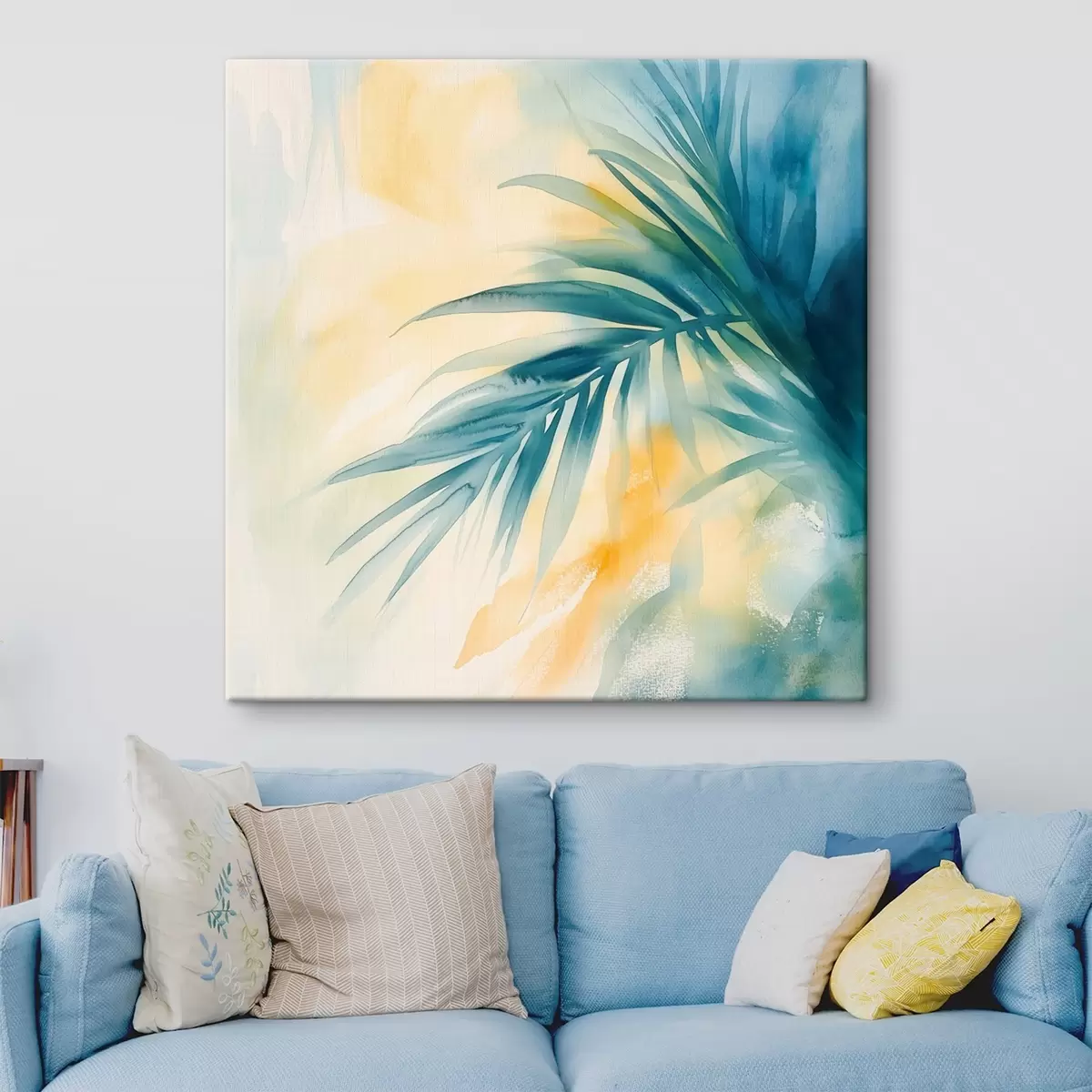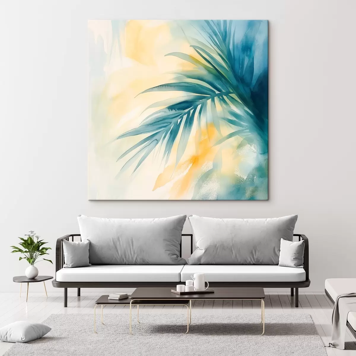 Gemälde Tropische Palmblätter in Blau- und Türkistönen vor einem Hintergrund aus warmen Aquarellflecken Art. s48849