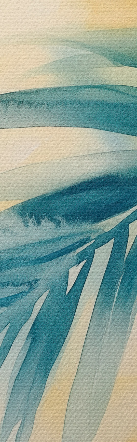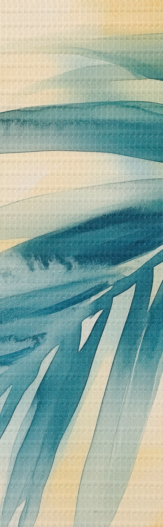 Fototapete Tropische Palmblätter in Blau- und Türkistönen vor einem Hintergrund aus warmen Aquarellflecken s48849